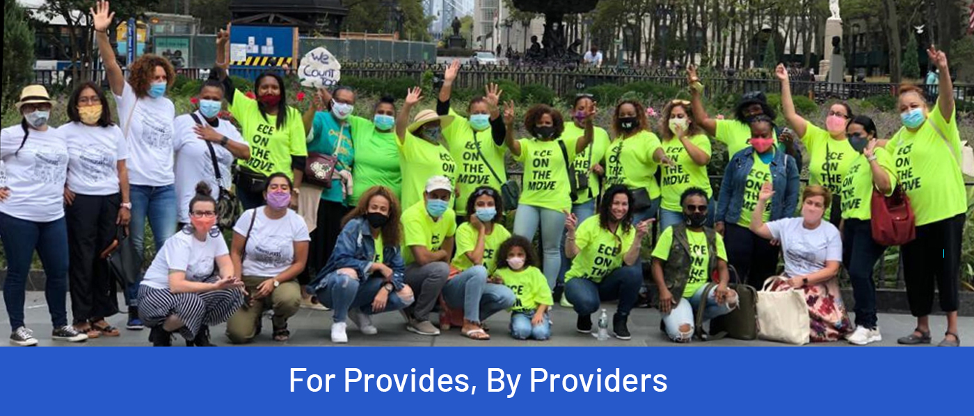 ECE en movimiento es un grupo de más de 600 educadores de la primera infancia que trabajan en entornos residenciales en la ciudad de Nueva York. A veces llamado "cuidado de niños en el hogar" o "cuidado de niños en el hogar", ECE en movimiento prefiere usar el término "educadores de la primera infancia" porque refleja con mayor precisión la habilidad de los servicios que brindan.